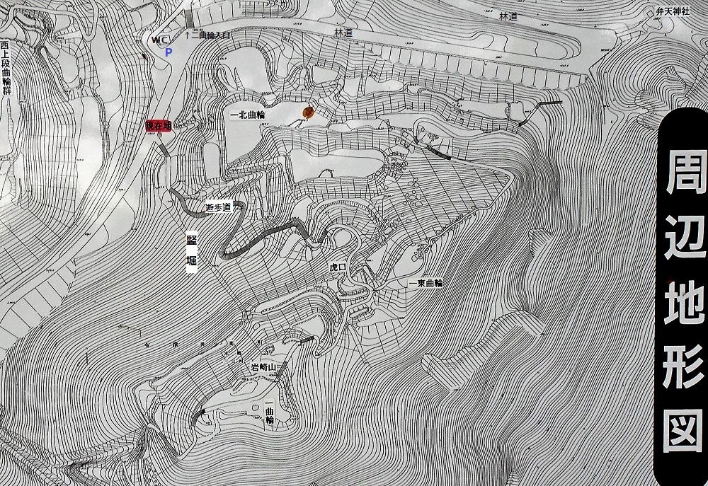 | 一曲輪~二曲輪~三曲輪をめぐる (案内図は現地パンフレットに追記し転載) ![]() 訪問時、タクシーを利用して、上の案内図の白いマルで囲んだ駐車場まで行きました。最初に一曲輪を見学し 駐車場まで戻り、二曲輪さらに、林道を下って三曲輪を見学。帰りは三曲輪でタクシーと待ち合わせて帰りました。 |