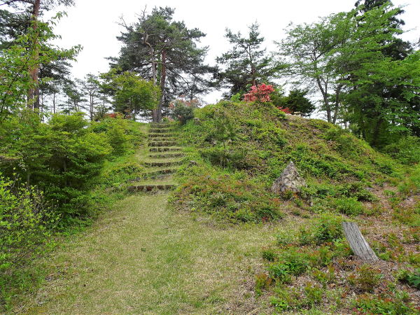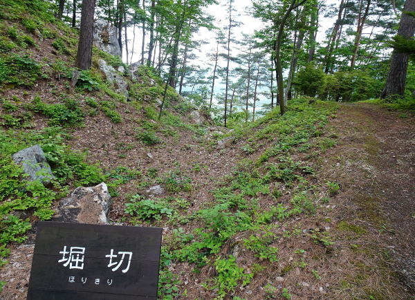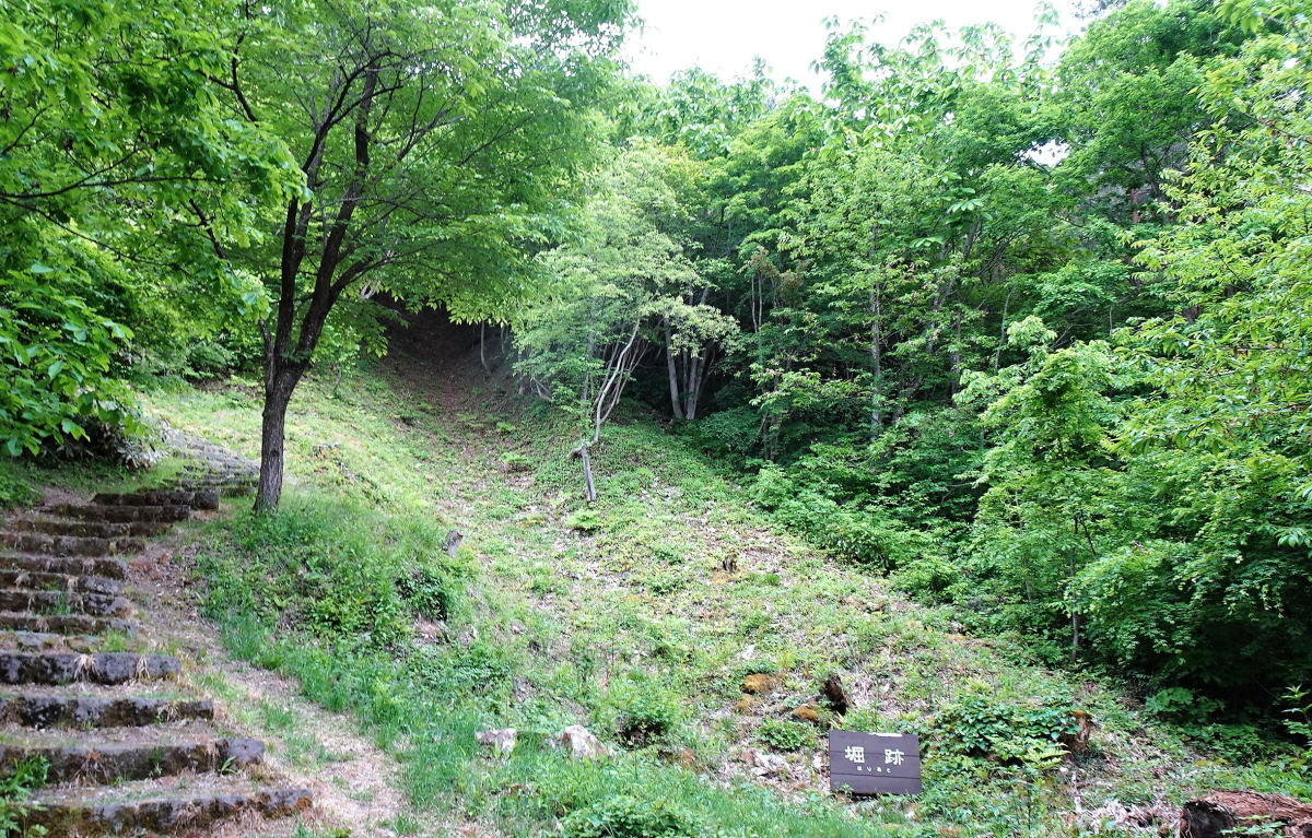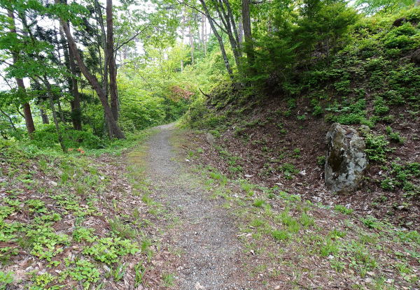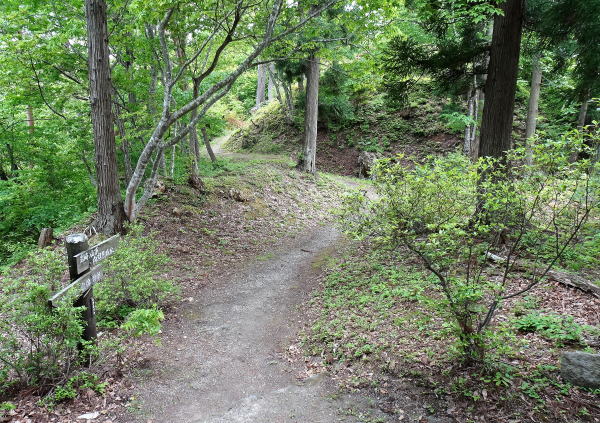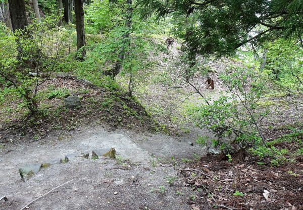 ![]() 一曲輪(実城)へ至る遊歩道 ここからさらに登って行きます。前方に土橋?のような通路と堀が築かれています。 |