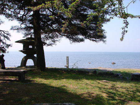 ![]() ■太閤井戸跡 琵琶湖の水量が多い時期は水面下に沈み、碑だけが見える。かつては城内にあった井戸で、城郭が現在よりも琵琶湖に張り出していたことがわかる。 |
