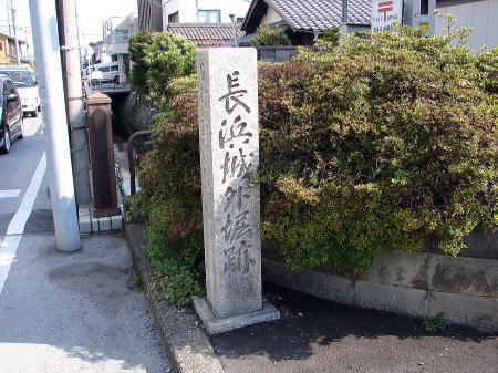 ![]() 長浜城外堀跡碑 外堀くすのき通りに建つ。長浜城は内堀と、内外堀・外外堀によって3重に囲まれていた。 |