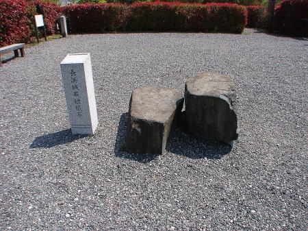 ![]() ■長浜城石垣根石 復興天守入口近くに、右の境界碑とともに展示されている。 |