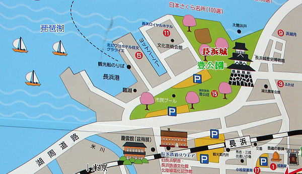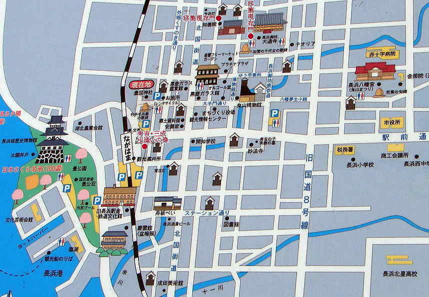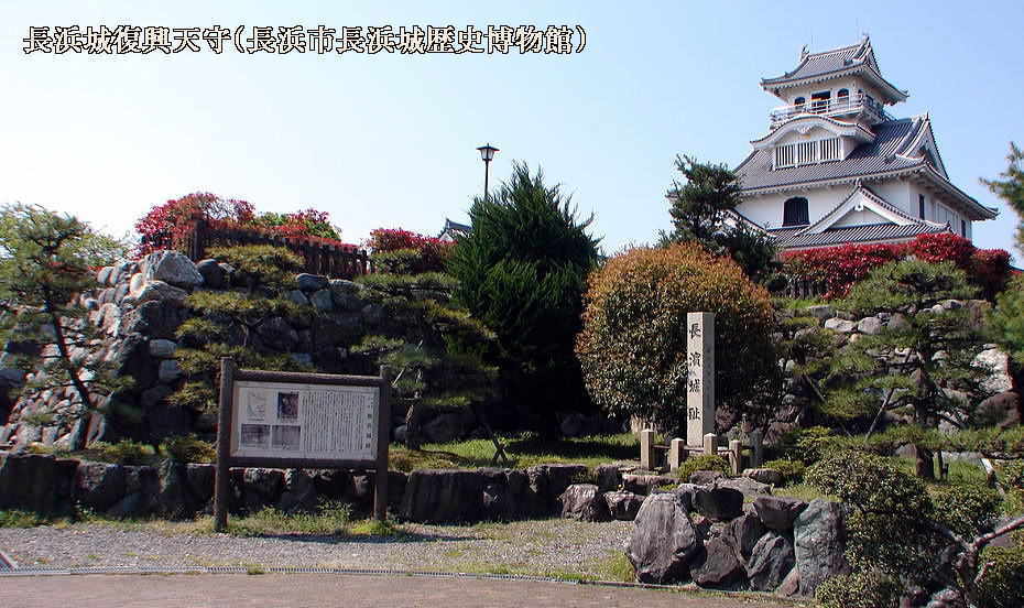 ■長浜はもと今浜といい、「バサラ大名」として有名な京極道誉(佐々木高氏)が室町時代の初め頃に出城を築き、それが長浜城の元と伝えられる。以後、家臣の今浜氏・上坂氏が守将として在城したといわれている。■姉川合戦の後、その功によって湖北三郡を与えられた羽柴秀吉は、天正2年(1574)頃、小谷(湖北町)から当地に城下町を移し、地名を長浜と改め、ここに城を築いて数年間居城とした。天正11年(1583)の賤ヶ岳の戦では、ここを根拠地として大勝し、織田信長後継者としての立場を確立した。秀吉の家臣である山内一豊も天正13年(1585)から5年間在城したことがある。 ■江戸時代になって、慶長11年(1606)には徳川家康の家臣である内藤信成が入城し、その子信正が摂津高槻に移るに至って廃城(元和元年・1615)となった。 ■建物及び石垣の大半は、彦根城の築城に際して移され、その天秤櫓(国・重文)や三重の隅櫓は当城の遺構といわれている。また、当市内の大通寺台所門(市指定建造物)、知善院表門(市指定建造物)も当城の遺構として名高い。この豊公園は「本丸」という小字名でよばれ、城域の中心部にあたるところから貴重な史跡として昭和37年に市の指定文化財として指定されている。 ■城跡の遺構は、これまでの発掘調査によって石垣や掘立柱建物跡、礎石建物跡さらには舟着場らしき石組遺構等が一部発見されている。しかし、調査は部分的であり、全体の縄張りや細部の構造については、未だ解明されていない。 (城内説明板より) |