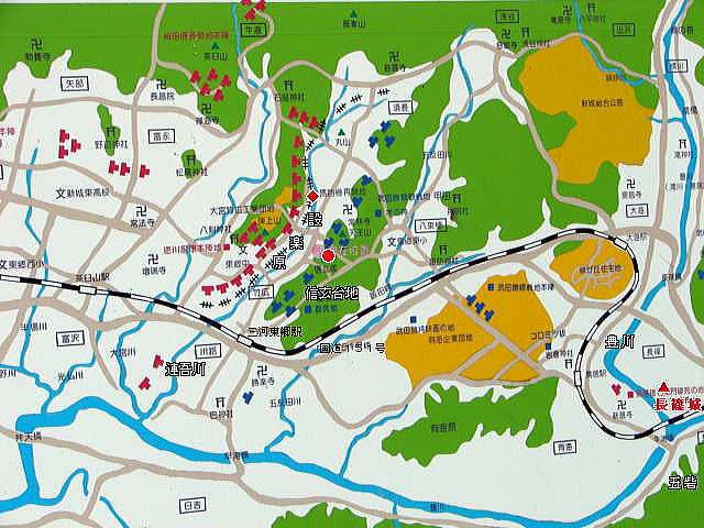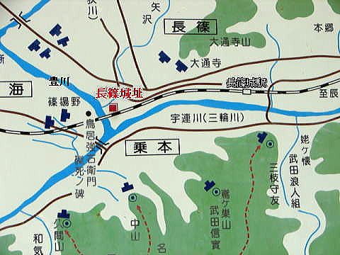◆要衝~長篠の地は豊川をさかのぼって約25km、長野県、静岡県北部に通じる道中にあり、このあたりから平地は山に移っていく。江戸時代の豊川舟運も長篠城を超えるところで終点になる。戦国時代、武田軍と徳川軍がこの城を奪いあったいわゆる境目の城であった。(境目の城は、敵領との境に築かれた城)