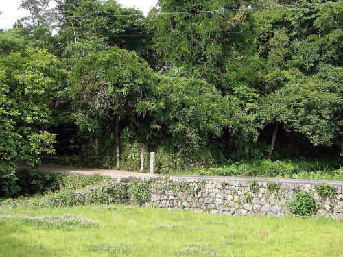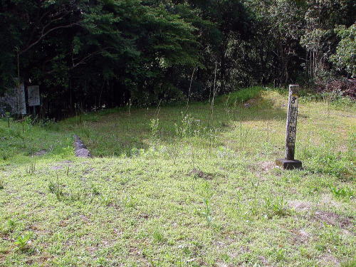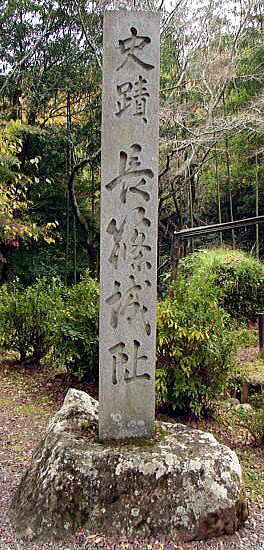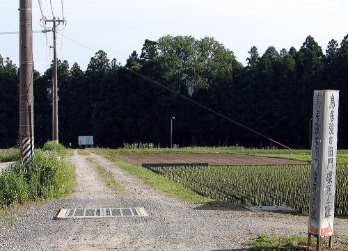 ![]() 鳥居強右衛門 磔死之趾 この道の突き当りあたりで、強右衛門がはりつけにされた。樹木で見えませんが後方は長篠城跡。 |