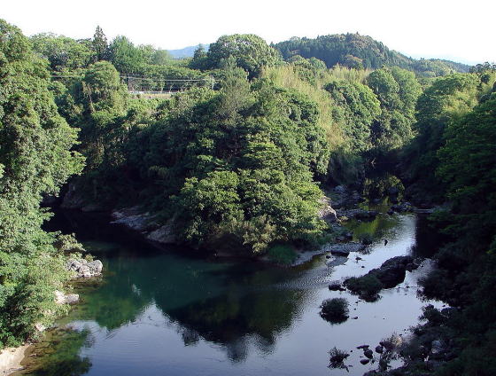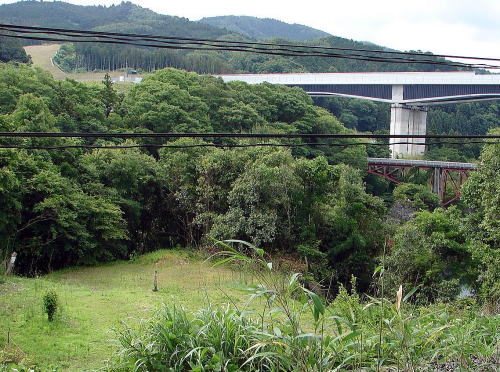 ![]() ▲本丸から見下ろす野牛郭 長篠城址の南端部になる野牛郭の前方は、宇連川と寒狭川の合流点で渡合(どあい)と呼ばれる所。向かいの橋は牛淵橋。上の白い道路は新東名高速道路。 |