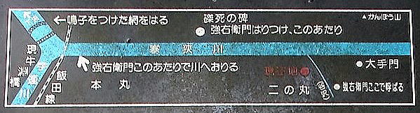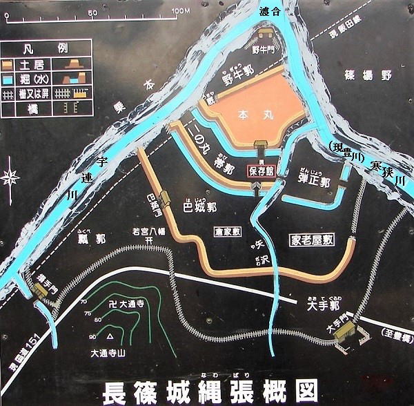 (右)長篠城縄張概図~現地説明板に追記し掲載。図は下側が「北」になります。現在は大手郭内を国道151号線が横切り、また本丸と野牛郭の間にJR飯田線が通っているため、本丸、野牛郭、弾正郭、二の丸以外はわかりにくくなっている。