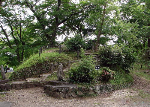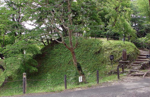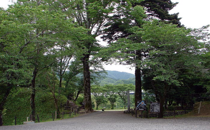 ◆土居と堀~この正面に見えるのは、本丸の土居と堀で天正3年の姿を残している。右手に門と土橋があり、続いて土居と堀が伸びていたが江戸時代に崩されて今はない。堀の土はかき上げられて土居にした。堀には水を引き入れた。土居と堀は直線に進まず直線に近い出入りがある。この形はやがて近世の城郭へ移り変わる姿を見せている。(現地説明板より)