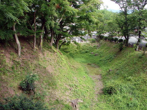 ![]() ▲土塁上から望む堀 本丸と二の丸帯郭(写真上部)の間の堀。かつては水堀であった。 |