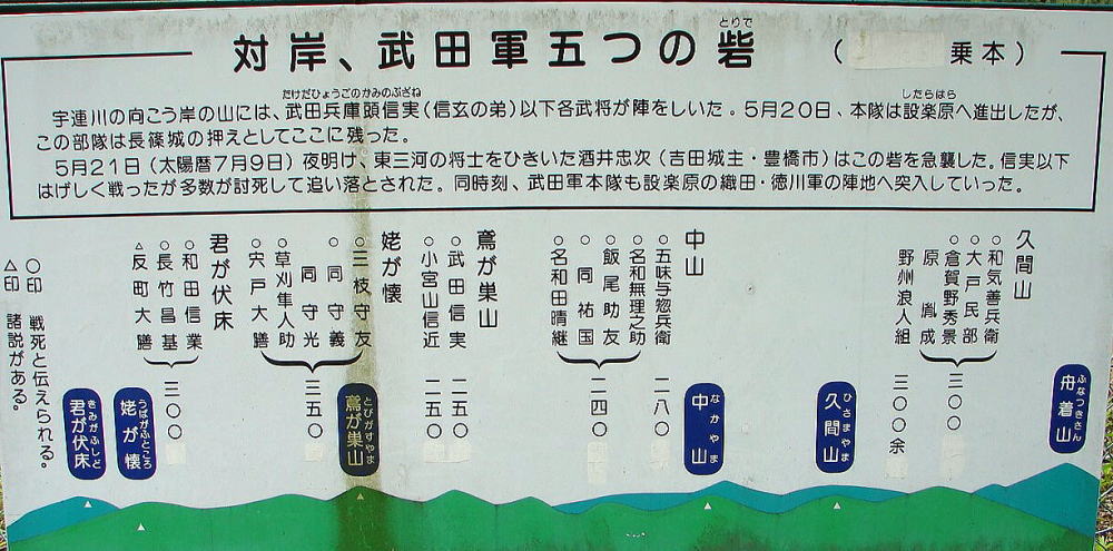 | 《長篠城は、元亀2年(1571)には一旦武田方に属したものの、2年後の天正元年には徳川方に降った城でもあり、天正3年5月に奪い返そうとして武田勝頼は長篠城を取り囲んだ。5月8日から毎日のように攻撃を仕掛けるものの、奥平貞昌以下500の城兵はよく戦って防ぐが、少人数で城を守るにも限りがあるため、貞昌は救援の使者として鳥居強右衛門を岡崎へ向かわせた。徳川家康はその報告を受け取ると、かねてからの約束通り織田信長の助けを借りて5月17日には設楽原へ出陣する》 ▼武田軍が長篠城を取り囲んだ武田軍五つの砦(長篠城本丸から望む) ![]() |