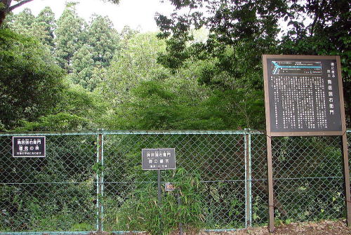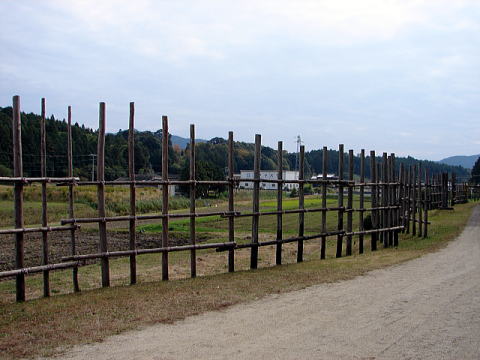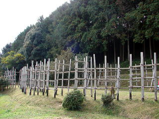 | 《設楽原へ到着した織田・徳川連合軍の総数およそ38000は連吾川の西側に陣をしき、馬防柵(まぼうさく)を築いた。これは当時日本一と恐れられていた武田軍を迎え撃つために、信長が考え出した戦法である。つまり、武田軍を柵の前におびき寄せて、隠し持った鉄砲3000挺(1000とも3000ともいわれている)を撃ちかけて一気に勝敗を決しようとする方法であり、このため、信長は、はるばる岐阜から柵木を持ち運ばせていた》 ▼復原された馬防柵と設楽原古戦場 連吾川の西沿い2kmにわたって馬防柵を造り、勇猛な武田軍の騎兵隊に備えた。 ![]() |