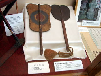 ![]() ▲軍配団扇(ぐんぱいうちわ) 軍を指揮する道具。柄が長い方は室町末期のもの。柄が短い方は江戸時代のもの。 |
