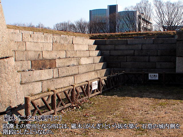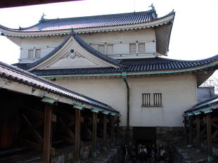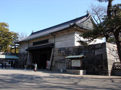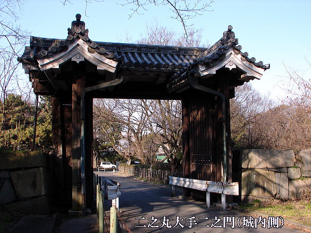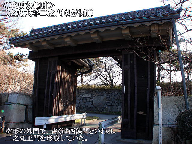 ▲二之丸大手二之門〜この門は二之丸西側にある桝形の外門となるもので、内門である大手一之門(現存せず)と共に古くは西鉄門といわれ、二之丸正門を形成していた。俗に桝形御門ともいい、一間一戸、屋根切妻造本瓦葺で、高麗門の形式をとる。