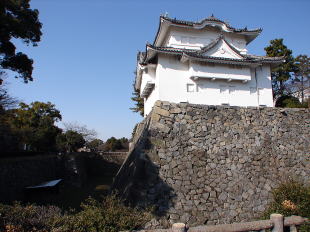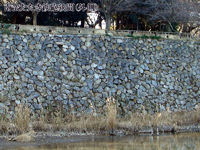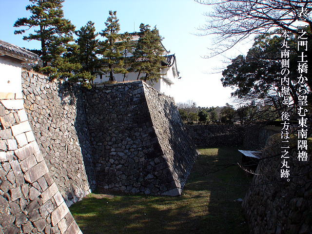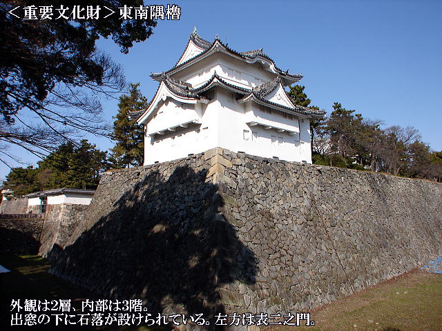 ▲東南隅櫓〜辰巳(たつみ)櫓ともいわれ、屋根2層、内部3階、屋根入母屋造り、本瓦葺、白塗籠造りである。東・南二方には、張り出した「落狭間(おとしざま)」が設けられている。この櫓は築城当時のものであり、鬼瓦には葵の紋が見られる。