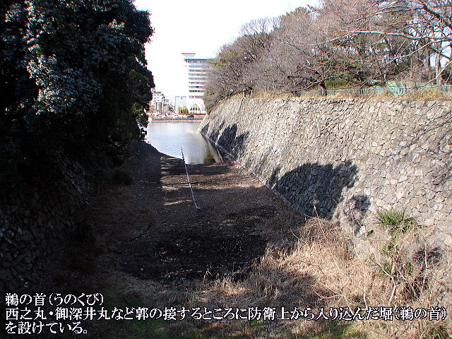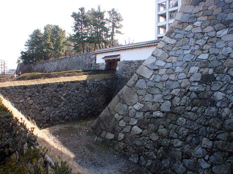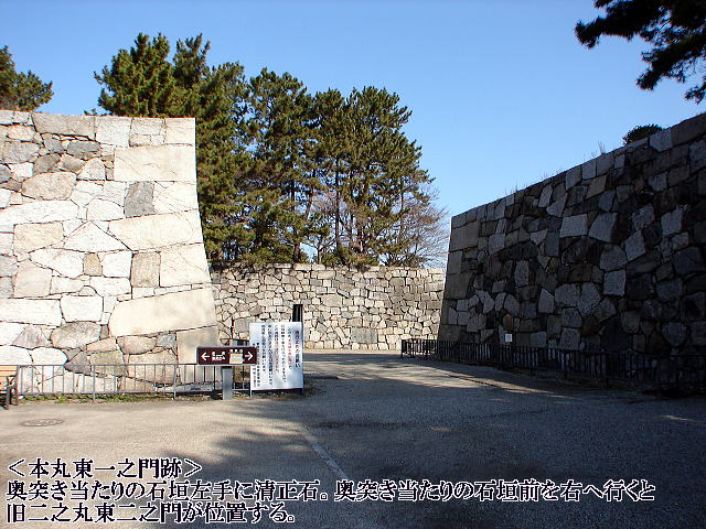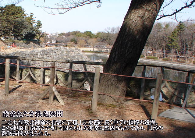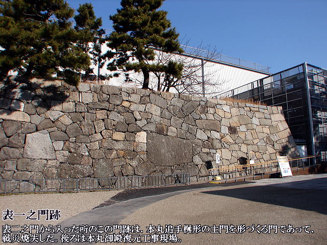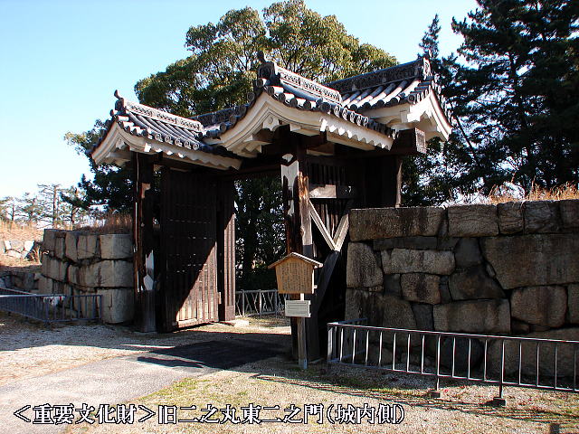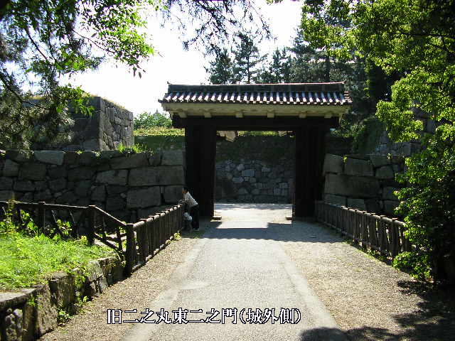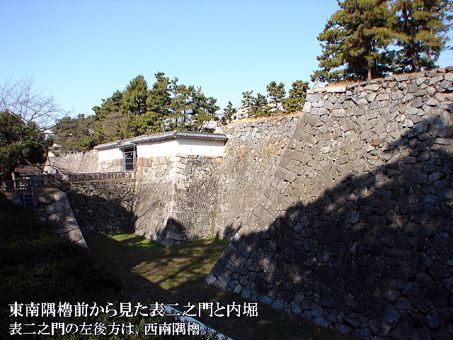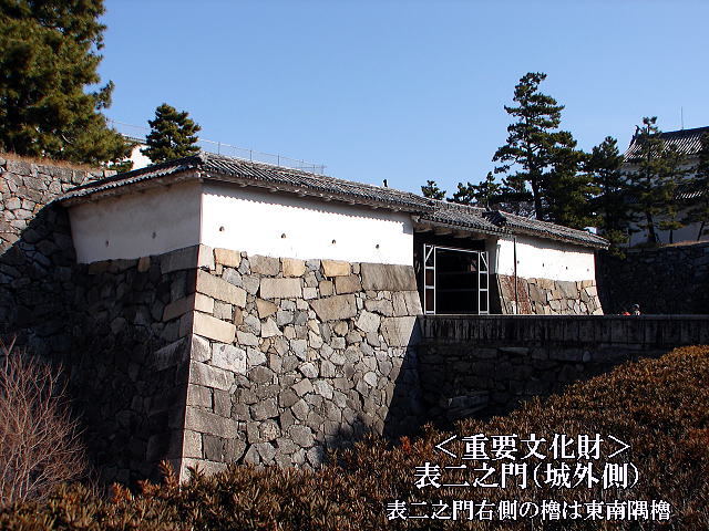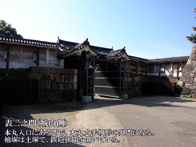▲表二之門〜古くは南二之門と呼ばれ、本丸追手桝形の外門に当たるもので、門柱・冠木とも鉄板張りとし、用材は木割りが太く堅固に造られている。袖塀は土塀として数少ない遺構である。