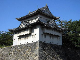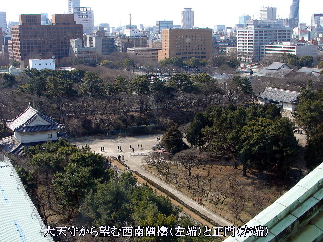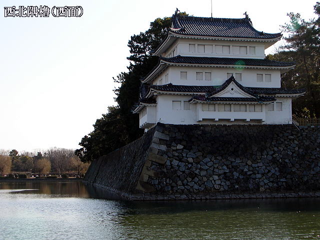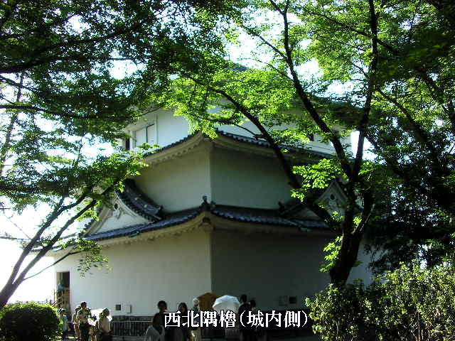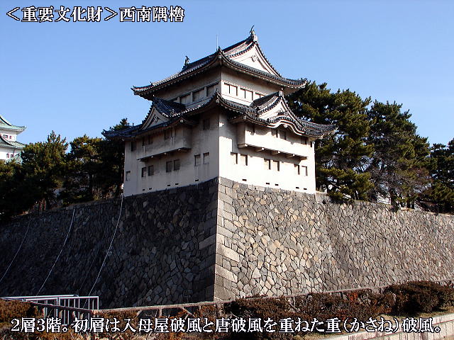 ▲西南隅櫓〜古くは未申(ひつじさる)櫓ともいわれ、屋根2層、内部3階の櫓である。外部に面した西・南両面には軍事用の「落狭間」(石落し)を張り出して屋根は千鳥破風にし擬装している。この櫓は、濃尾大地震で石垣と共に崩壊したが、大正12年(1923)宮内省によって修理復旧され、鬼瓦などに菊花紋が見られる。