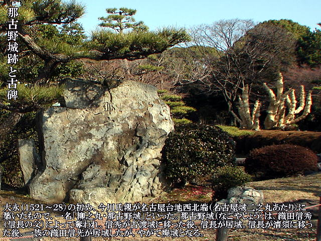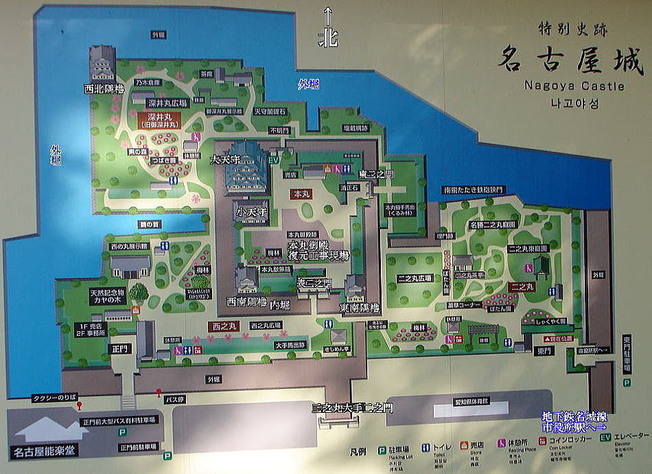 ■名古屋城は、関ヶ原の合戦後江戸幕府を開いた徳川家康が、慶長14年(1609)江戸幕府の東海道の要所として、また大坂(現大阪)方への備えとして清須(現清須市)から名古屋へ城を移すことを決意し、翌15年(1610)に着工、17年(1612)に完成させた代表的な平城です。■普請(土木工事)を命じられたのは加藤清正、福島正則、前田利光など北国・西国の大名20名、城内の石垣には各大名や家臣たちがそれぞれの運んだ目印(刻紋)が多数残っています。その後、名古屋城は明治維新を迎えるまで、徳川御三家の筆頭尾張家の居城として栄えました ■明治に入り陸軍省の所管となり、名古屋鎮台司令部や兵舎がおかれましたが、明治26年(1893)に宮内省に移管され「名古屋離宮」となりました。昭和5年(1930)12月、離宮が廃止、名古屋市に下賜され、翌年2月から一般公開が始まりました。昭和20年(1945)5月の空襲で大小天守閣と本丸御殿などが焼失しましたが、焼失を免れた3つの隅櫓と3つの門、御殿障壁画1,047面が国の重要文化財に指定されています。昭和34年(1959)に大小天守閣と正門は、ほぼ昔どおりの外観で再建されました。 |