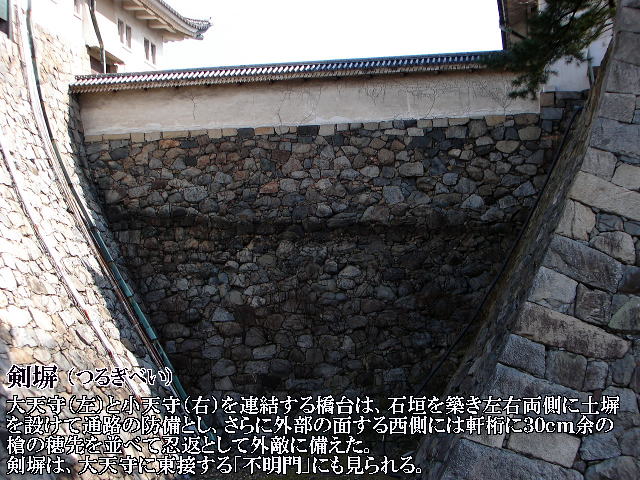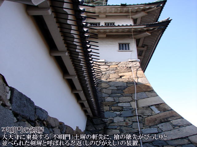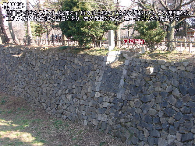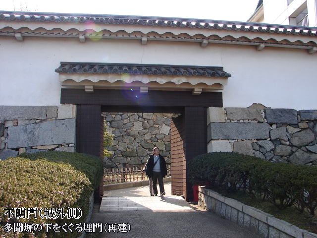 ▲不明門(手前の石垣は大天守台)〜多聞櫓の下をくぐる埋門(うずみもん)で、本丸御殿の大奥へ通ずる秘門であり、常に鍵が厳重に施され、別名を「あかずの門」といった。昭和20年5月14日、空襲で天守閣などとともに焼失。昭和53年3月、原形の通りに再建した。