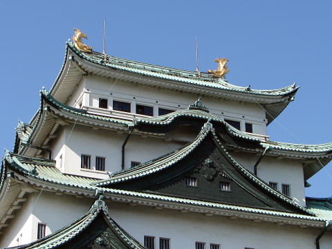 名古屋城にあってもっとも名高いのは金鯱です。城の大棟に鯱を掲げることは室町時代の後期、城郭形態の完成した頃から始まったと言われている。当時は火除けのまじないであったものが後には城主の権威の象徴として大棟に飾られた。