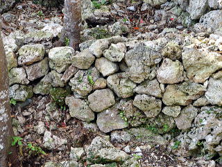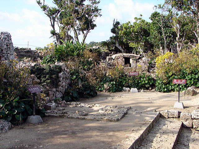 ![]() 鍛冶屋跡(カンジャーガマ) 鍛冶を行っていた所と言われているが、城のためか集落のためか定かではない。 一説によれば護佐丸が阿麻和利に備えるために武具を造っていたとも伝えられている。 |