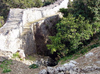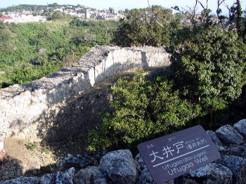 ![]() 画像(左・右)は、北の郭にある大井戸跡(ウフガー)。 西の郭にも夫婦井戸と呼ばれる二つの井戸がある。 城郭内に水を確保していることが、この城の特徴でもある。 |