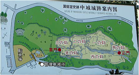 | 中城城跡案内図 (現地説明板に一部追記) ![]() 城は、連郭式の山城で、六つの郭で構成される。城壁は、主に琉球石灰岩の切石で積まれており、 自然の岩石と地形的条件を生かした美しい曲線で築かれ、六連郭の構えは琉球屈指の名城とされる。 |
