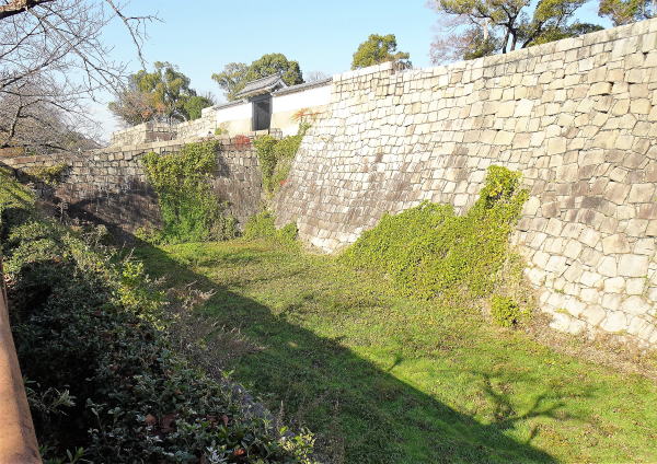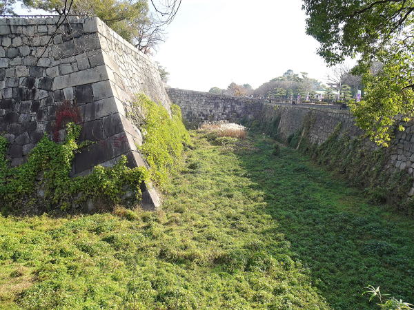 ![]() 本丸南側の空堀 空堀奥には桜門が位置する。ここは寛永元年(1624)、徳川幕府による大坂城再築工事の際に築かれたもので、当初から空堀であった。これに先立つ豊臣秀吉築造の大坂城でも本丸の南は空堀となっており、大坂の陣で徳川方が埋めたわけではない。なぜここだけ空堀としたのかは不明である。 |