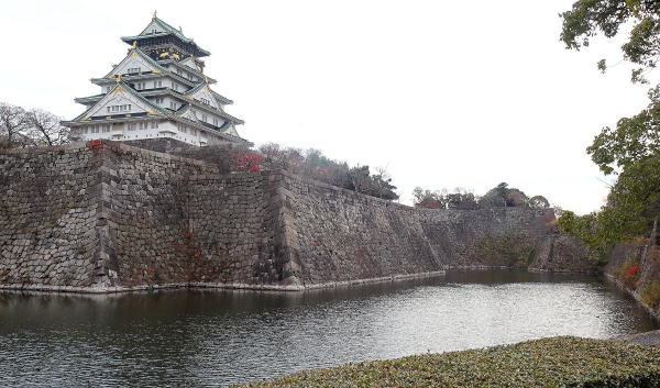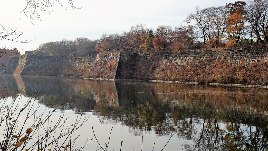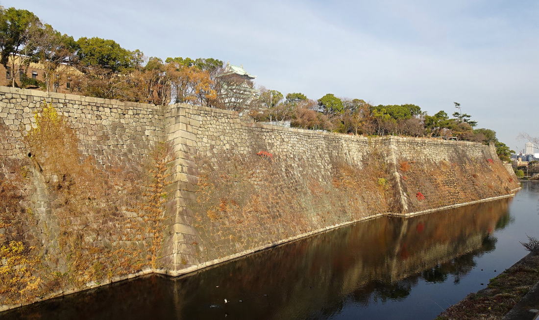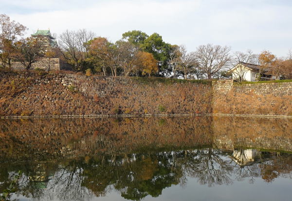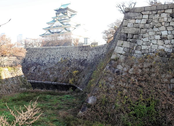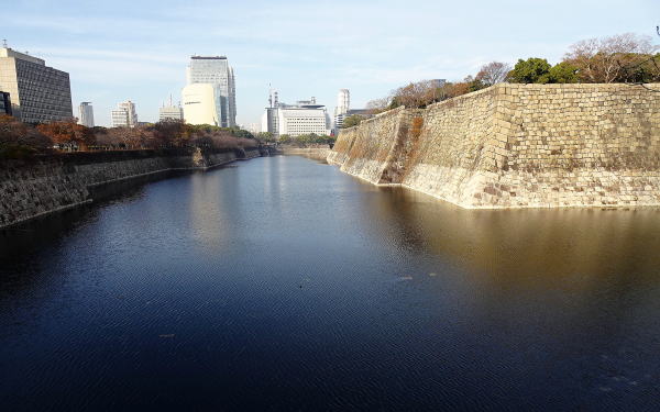 | 本丸を取り囲む堀で、南側を空堀とするほかは水堀となっている。寛永元年(1624)開始の徳川幕府による大坂城再築第2期工事により、豊臣時代の本丸に盛り土をほどこして石垣が築造された。総延長は約2.7キロメートル、東側石垣の高さは水面から約24メートルに達する。本丸内には堀に面する石垣の角を中心に3層の櫓が11棟、2層の櫓が2棟そびえていたが、明治維新の大火により全て焼失した。 | |