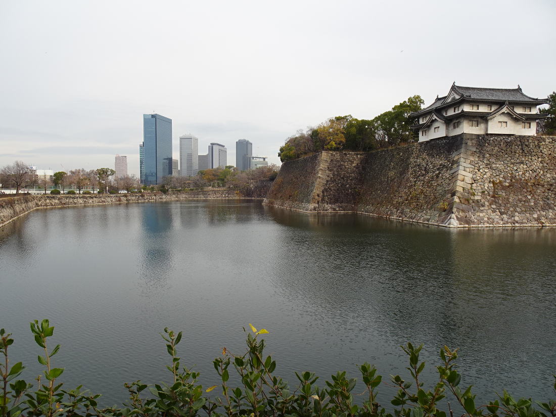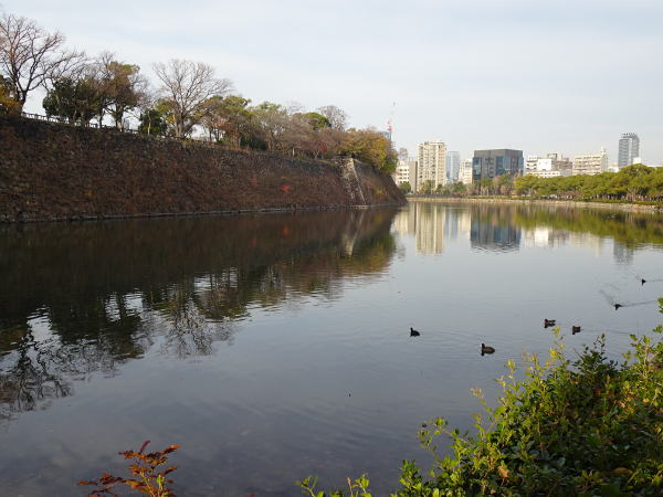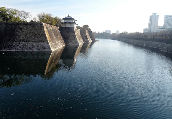 乾櫓と西外堀。背後は大阪ビジネスパークのビル群 |