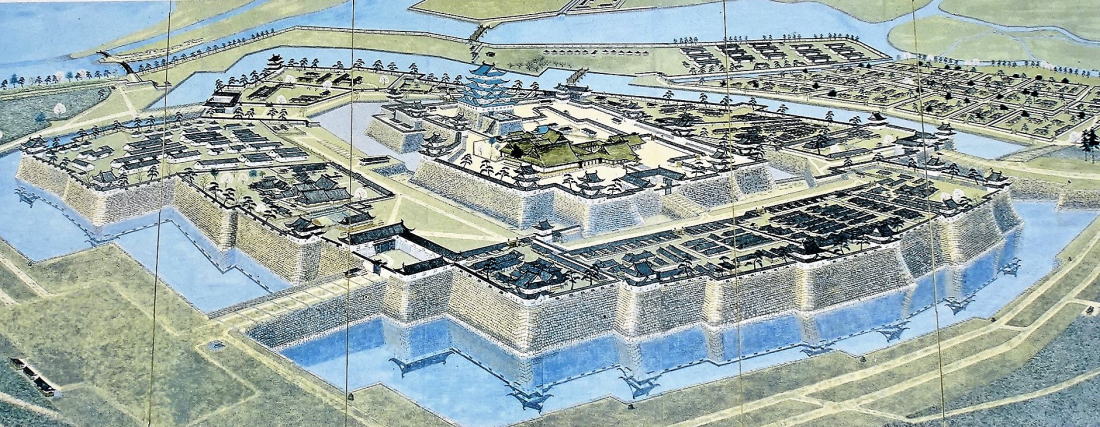 高い技術で積まれた“石垣”と広くて深い“水堀” ![]() 最盛期の徳川期大坂城を描いた屏風絵(武内勇吉作、大阪城天守閣蔵) 写真左手前が大手門側。絵は城内説明板より。 |