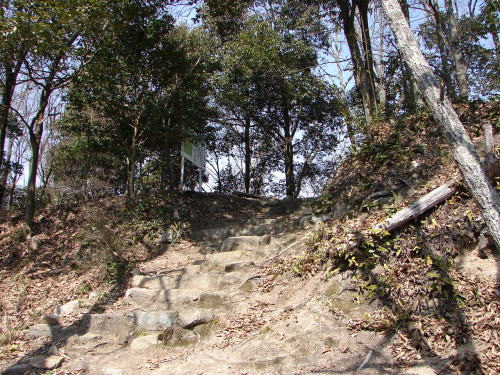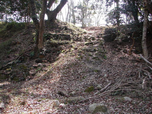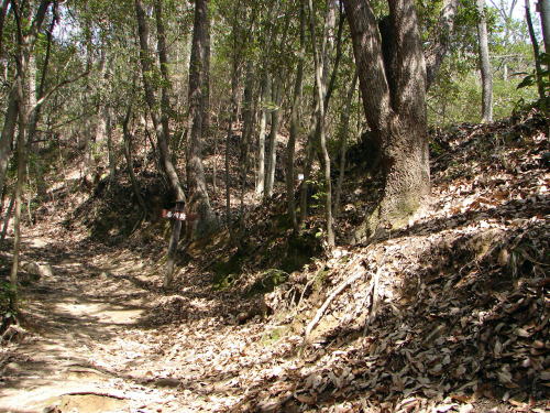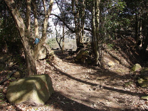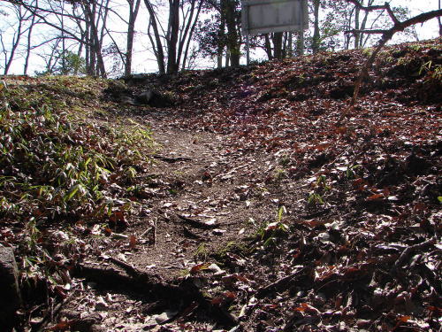 ![]() 本丸に残る大手門跡 釣井の段側から本丸跡へと登りきったところには門があったとされる。この場所は、外枡形の大手門跡と推定される。ここを少し登った所が左下写真。 |