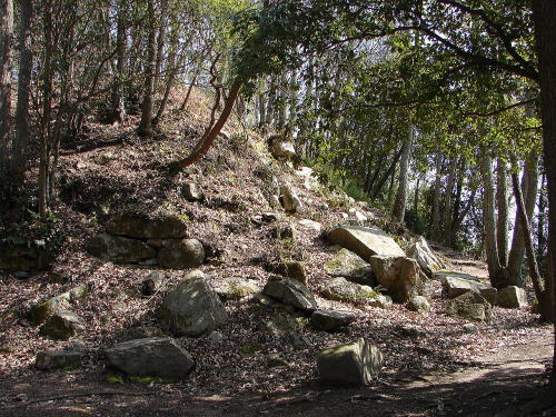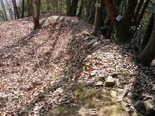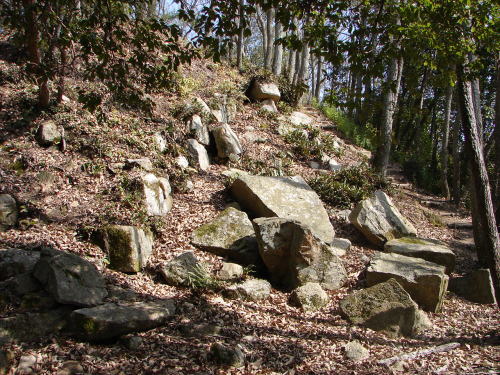 ![]() 本丸下に残る石垣の跡 右側から登って行くと、右写真の内枡形に至る。 |