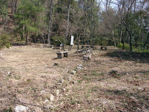 ![]() 番所跡 軽石の段、中の段、下の段の三郭からなり、大手道(写真左下の道)を警護する番所が設けられていた所。 |