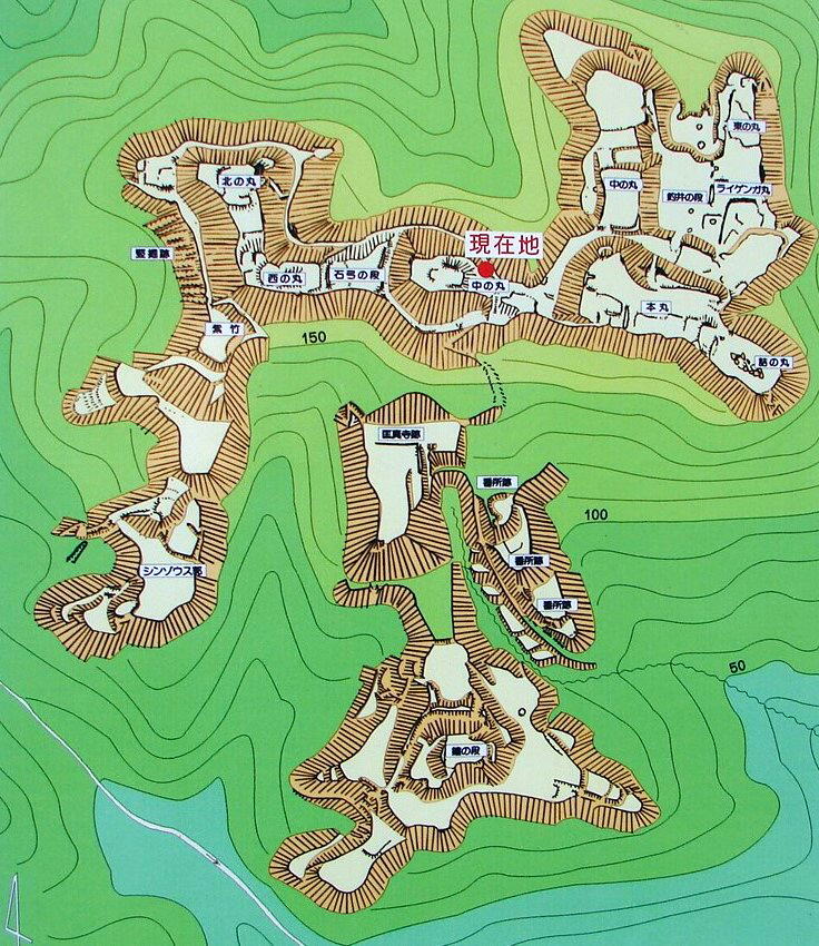 【縄張図】 城域は山頂の内郭部と山腹の外郭部に分かれる。【内郭部】 本丸は、山頂尾根を削平した四段からなり、東西125mに及ぶ広大な郭で、西側と北側の斜面は巨石による石垣で補強している。東端の最高部は標高197.6mで巨石が露出しているが、この上に櫓をあげていたものと思われ、近世城郭の天守台にあたる郭である。本丸の広い郭には、居館の跡と思われる礎石が一部露出しており、また、西側の中の丸からの登り口にあたる本丸西南隅には内枡形の跡が残っている。 本丸の北方に四段の郭からなる東の丸、井戸郭(釣井の段)、五段の郭からなる中の丸、西方にも四段の中の丸の各郭が配置され、これらが二の丸の縄張りである。中の丸の郭には随所に土塁を築き、曲輪を設けて防備を固めている。また、北方の中の丸の広い郭には礎石の配置が一部みられ、規模の大きな建物があったことが知られる。 中の丸に続いて西方に配置された四段が西の丸で、これからさらに北西にのびる北の丸の五郭が連なっている。これらが三の丸の縄張りである。西の丸の東端の郭は石弓場と呼ばれるが、それ自体が二の丸を守る箱薬研の堀切の役割を果たしている。また、北の丸の中心的な郭には石積みの方形基壇が残っており、社寺に類する建物があったと思われる。 【外郭部】 外郭は斜面の中腹から張り出した二つの尾根を利用し、大手側を固める意図をもって巧妙に配置され、匡真寺跡・鐘の段・番所跡・紫竹の丸・シンゾウス郭・大手道などがある。 これらの郭はすべて地山を削平し、又は、切削り、あるいは堀切り、必要な箇所は石積で補強し、随所に帯曲輪や腰曲輪で結ばれ、また、石垣、空堀、竪堀を設けている。とくに近世城郭に関連する枡形城門の採用が各所にみられる。 |