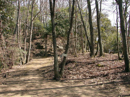 ![]() 中の丸跡 本丸北側に位置する中の丸への虎口と土塁か?。右側の道を奥に進むと釣井の段(井戸郭)、本丸大手門跡へと至る。 |