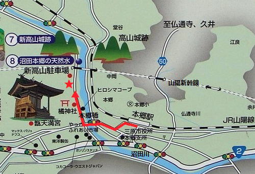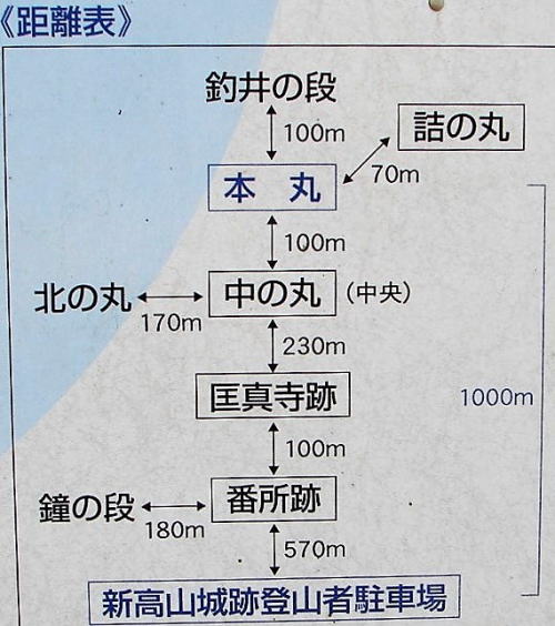 新高山城跡周辺マップ![]() ―は本郷駅より大手道入口までの徒歩ルート(1.8km 約25分)。本郷橋を渡り、本郷橋西詰を右折し北に向かうと大手道入口の看板が設置(★は新高山城跡大手道入口。北側には駐車場有)。 大手道入口から少し登ると城跡説明板があり、そこに登山用の杖と縄張図入りのパンフレットが置いています。沼田川を挟んで新高山城の対岸には高山城が向き合って位置する。 右距離表は現地説明板より。訪城日〜2018年3月。 |