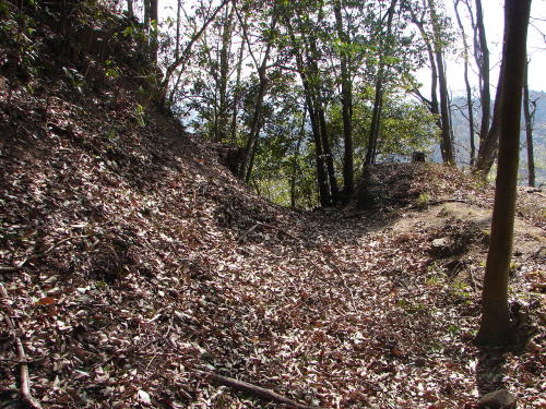 ![]() 石弓の段(石弓場)から西の丸郭群を望む 手前が石弓の段となり、曲輪跡にしか見えませんが説明板には「それ自体が二の丸を守る箱薬研の堀切の役割を果たしている」。 また、石弓の段東端(二の丸との境目)には右写真のような堀切跡と思われる部分があります。 |
