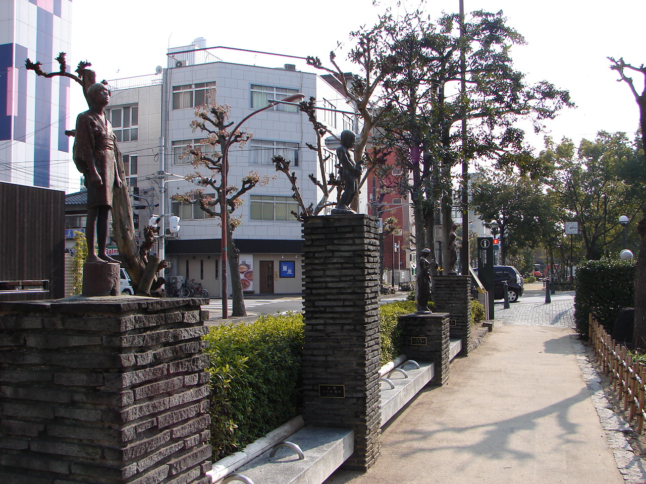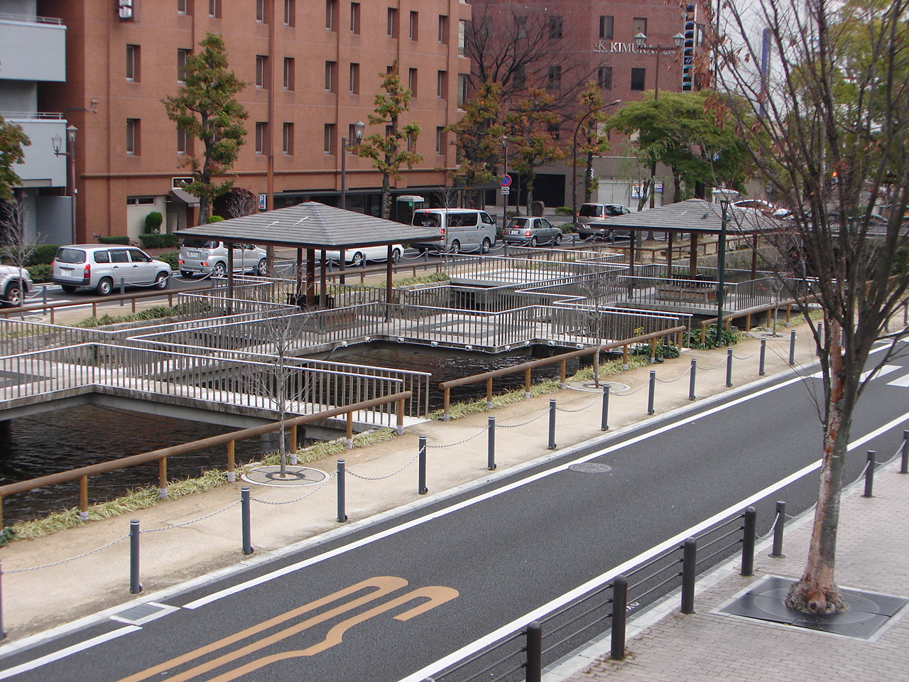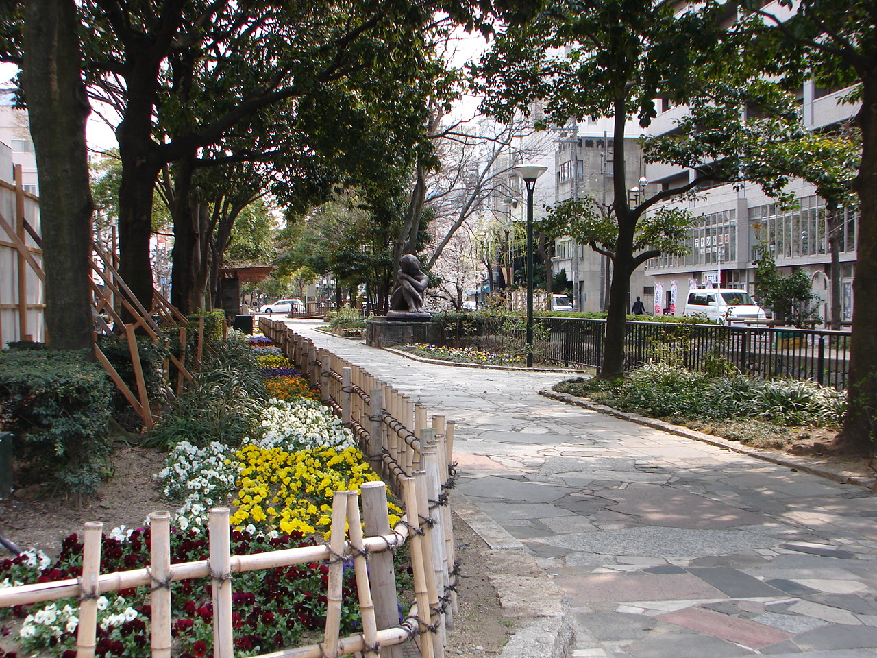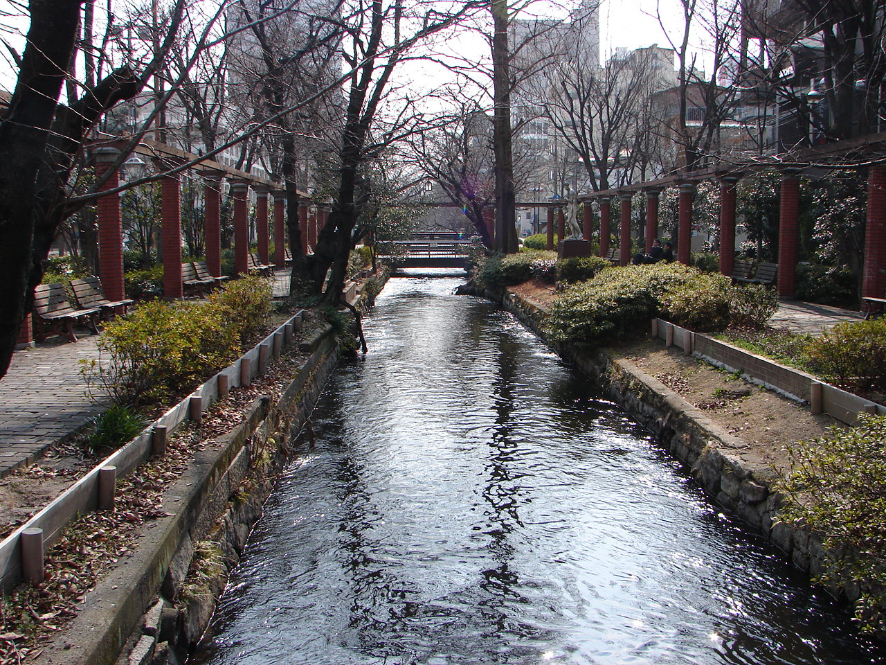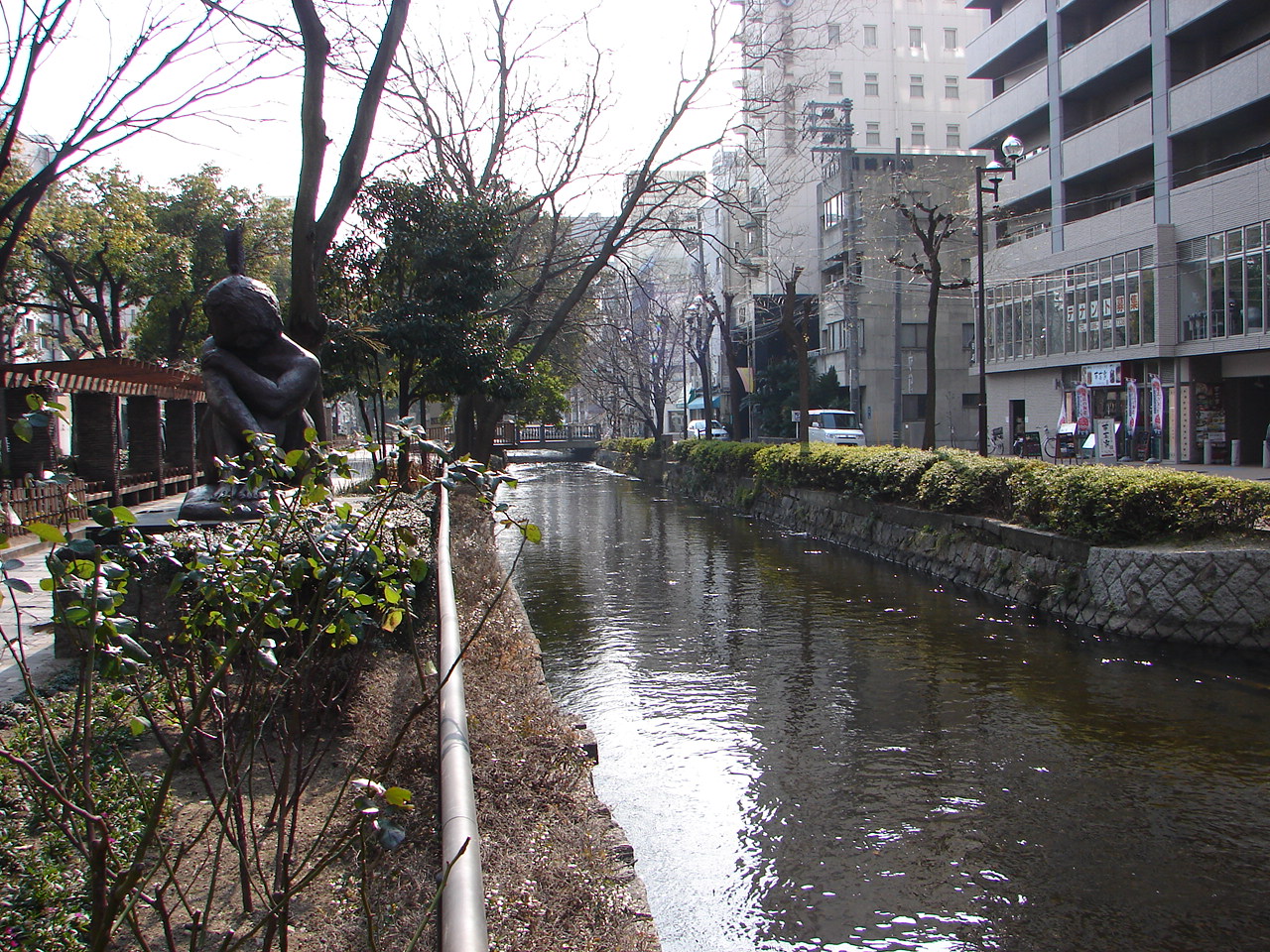 ![]() 西川緑道公園 川岸には像やパーゴラなどが設置されている。 |