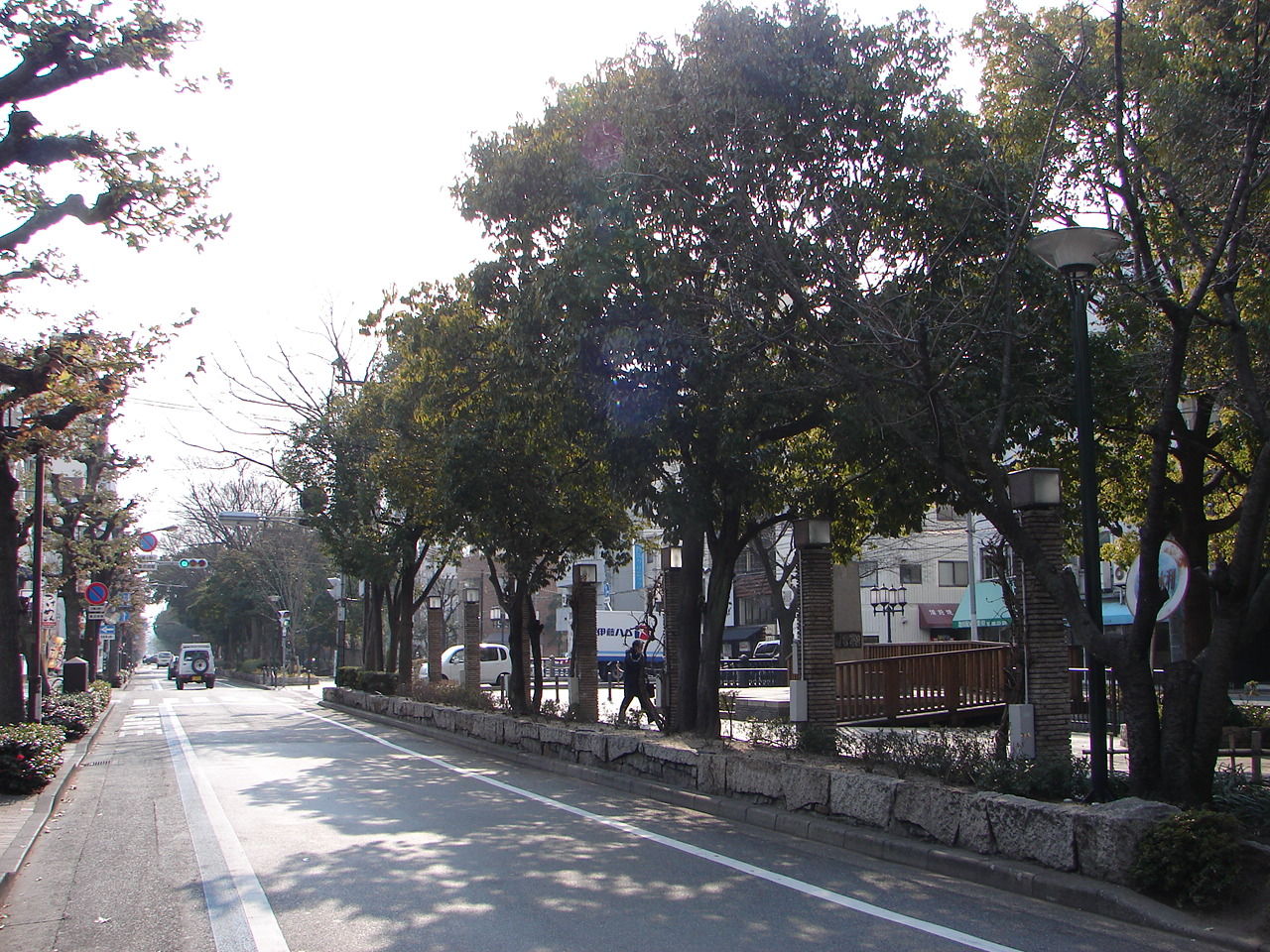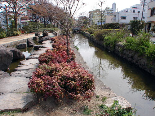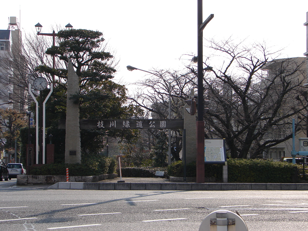 ![]() 枝川緑道公園は、南へ大学病院通りの鹿田橋まで500m続く |