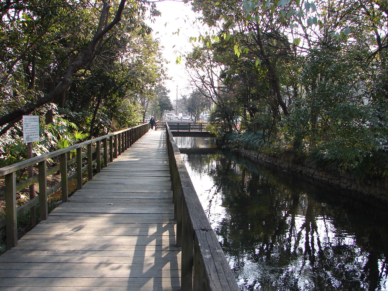 ![]() ほたるみち 板木の小道が、せせらぎの音とともに続く。「ほたるみち」から南へ直進すると2号線の瓦橋にでる。瓦橋を渡ると、西川の支流枝川用水にも緑道公園が整備されている。 |