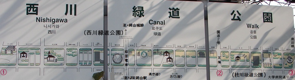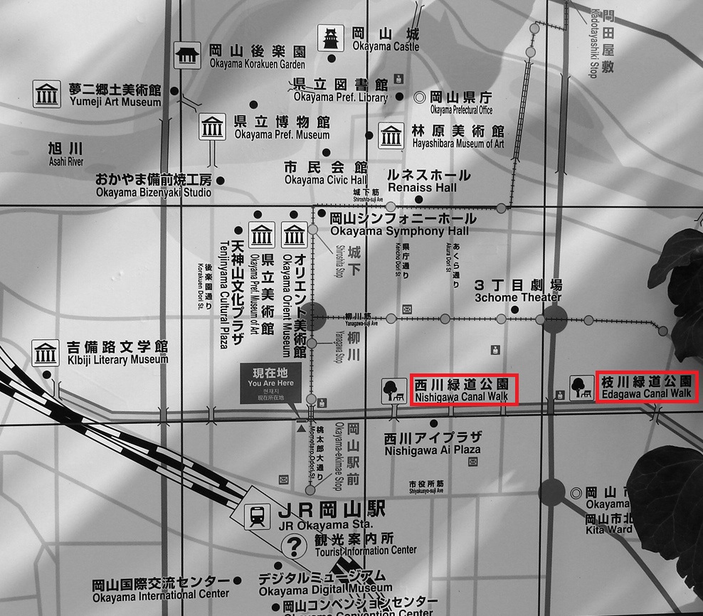 ![]() 西川緑道公園周辺図 西川緑道公園は、岡山市街地を南北に流れる西川沿いの公園。街中にありながら、四季折々の花や、清らかな水の流れを感じることができる。 |