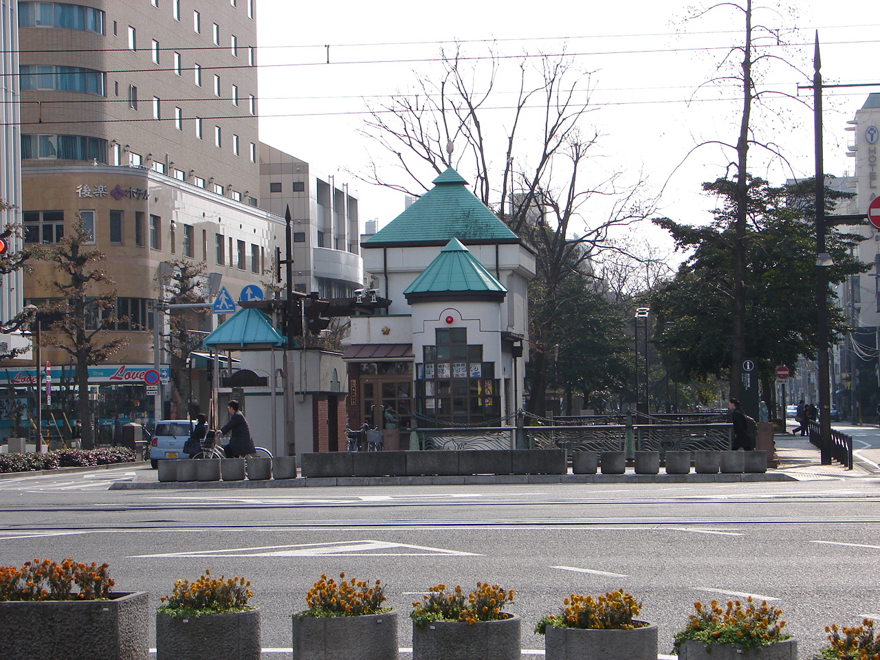 ![]() 西川橋交番 JR岡山駅から路面電車に沿って東へ500mほど行くと、南北に流れる西川用水と両岸に整備された西川緑道公園に出会う。西川橋交番は、桃太郎大通りを挟む西川橋の南に位置し、ここから北と南へ緑道公園が展開する。 |