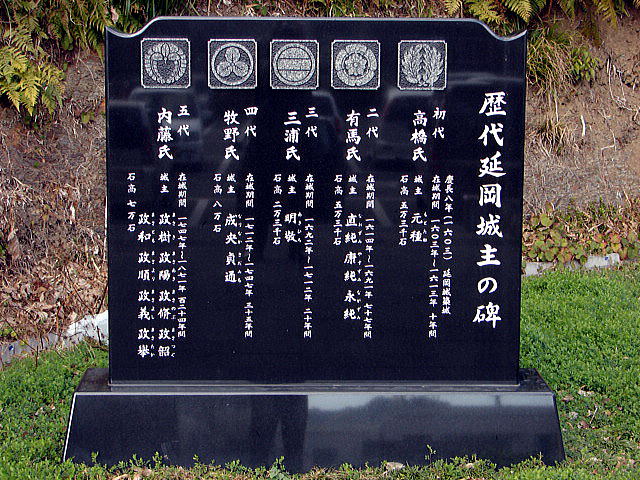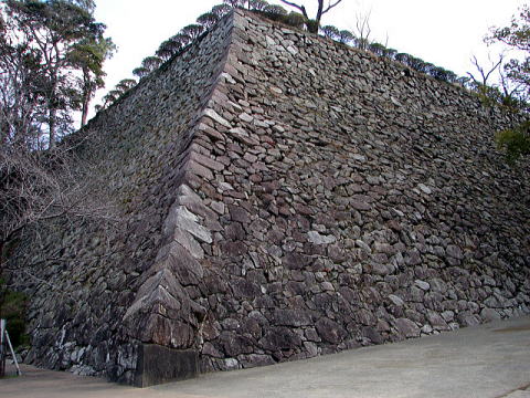 | 【沿 革】 県城(あがたじょう)・亀井城(かめいじょう)ともよばれていた。本格的な築城は、豊臣秀吉による九州平定において軍功のあった高橋元種(たかはし もとたね)が県城を改築して延岡城とし、1603年((慶長8年)に城を完成させた。城主は高橋氏ののち、有馬・三浦・牧野・内藤氏と替わるが、有馬氏の時代に、城名を延岡城と改め、城と城下町はさらに拡大整備された。 現在城跡は城山公園となって、「千人殺し」とよばれた石垣が残されている。この石垣には仕掛けがあって、ひとつの石を外すと石垣全部が崩れて、千人を殺すことができるという伝説がある。この石垣の他に、天守台跡・井戸跡・曲輪跡・復元城門などの遺構が残る。形式は梯郭式平山城で、本丸を中心にして、段下がりに二の丸・三の丸を張り出すように縄張されている。 |