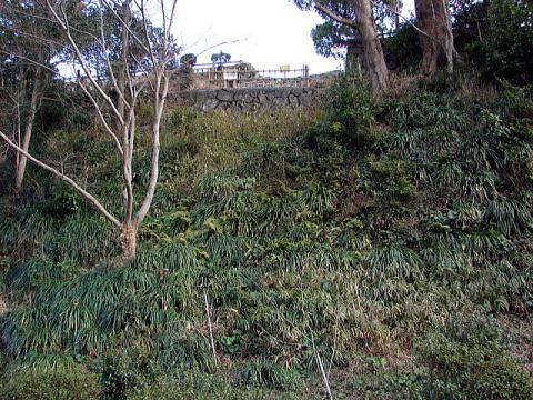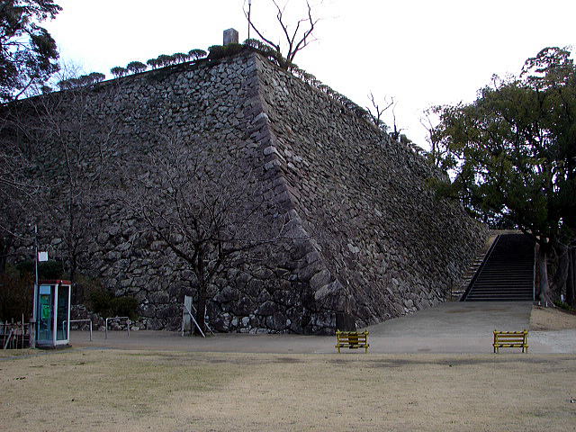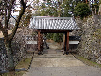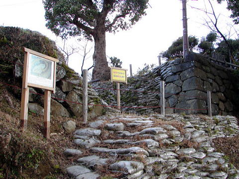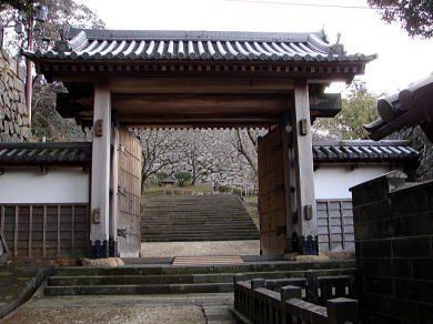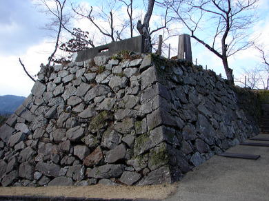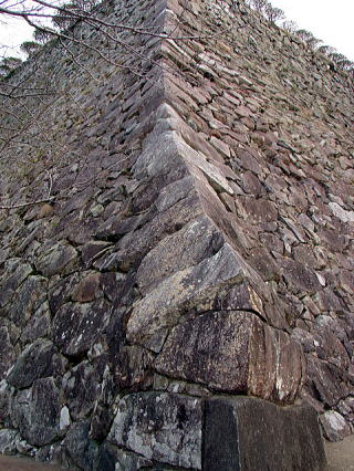 写真左〜城外側。門をくぐって石段を上がったところが二の丸跡。「千人殺し」とよばれる高石垣がそびえる。