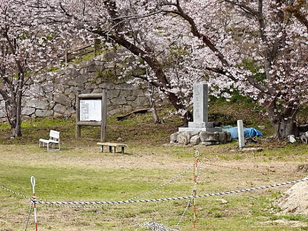 ![]() 解説サイン・史跡指定碑と桜 後ろの石垣(後世のもので遺構とは関係ない)を登って三之丸を訪ねます。 |
