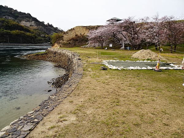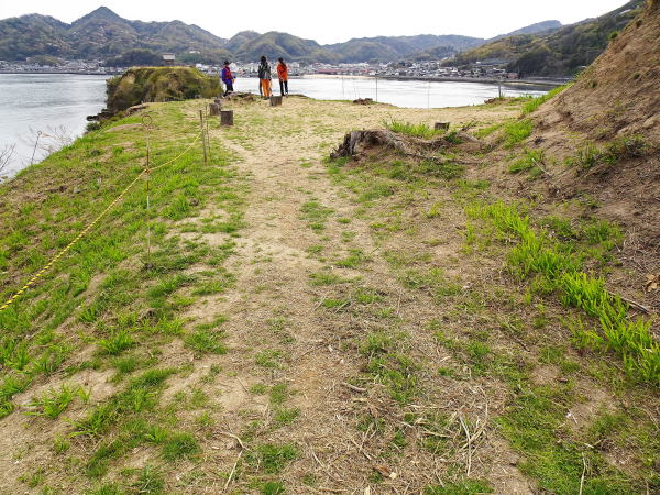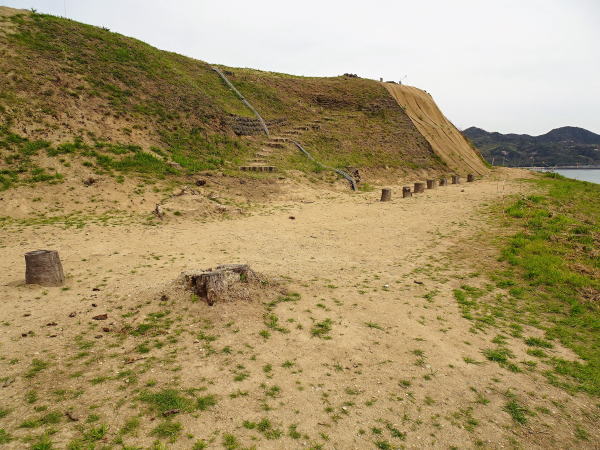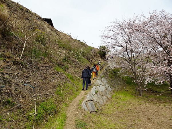 ![]() 南部平坦地 四阿のある郭が三之丸で、三之丸下には、桜と石碑が立ち、ここから園路を上って登城開始です。南部平坦地は、能島でもっとも下段に位置する郭と考えられます。 |
