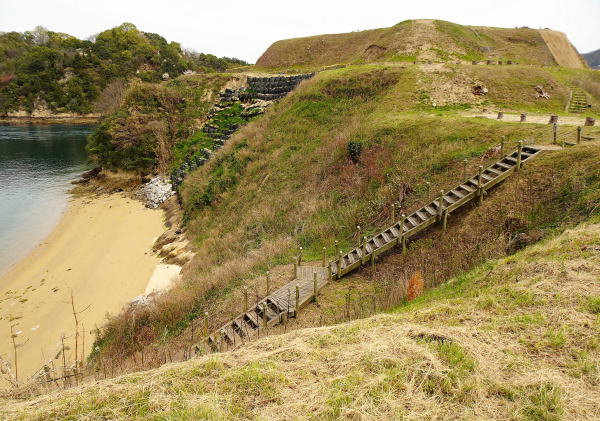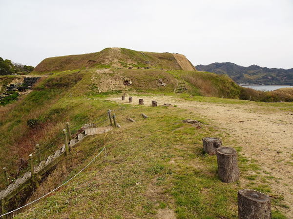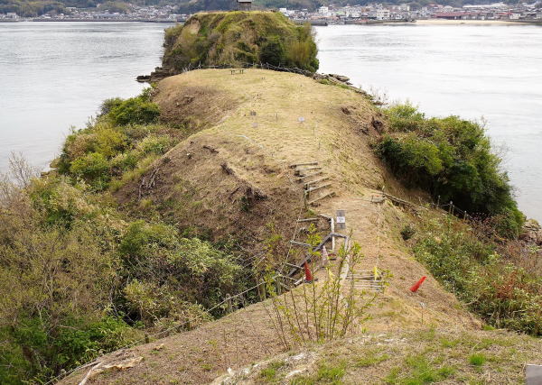 ![]() 三之丸から望む二之丸・本丸と左下は船だまり 頂上の台形状が本丸、その下段が二之丸。 |