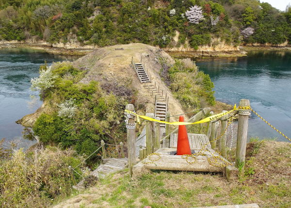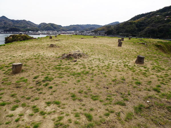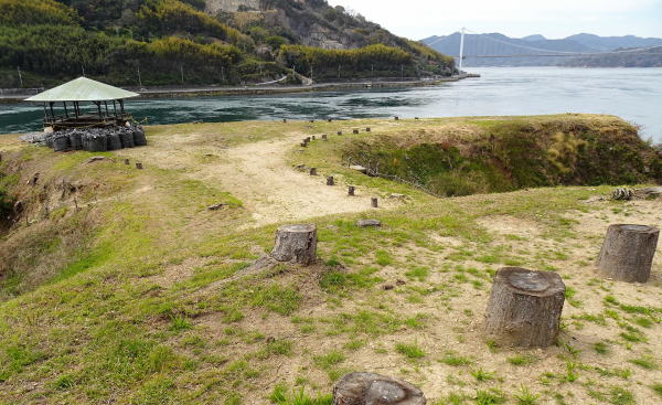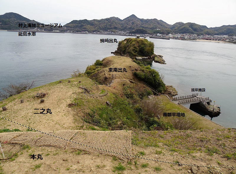 ![]() 東南出丸 後方の島は、鯛崎出丸です。能島は、不定形な三角形の島で、東部(矢櫃)と南部(東南出丸)の突端は岬状に伸びており、鯛崎島は、能島に隣接する南北に細長い小島です。 |