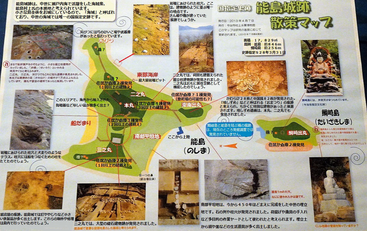 ![]() (画像は村上海賊ミュージアム内の解説板より。一部文章等については、画像では見にくいため消却し追記) 左上ⓐ(本丸説明文)~まるで船折瀬戸をのぞむように、小さな掘立柱建物が建っていた痕跡がありました。「井楼」(せいろう)といわれる物見やぐらと考えられます。二之丸、三之丸、矢びつでもこれに似た遺構が発見されました。本丸では素焼きの皿(かわらけ)の破片が1万点以上も出土しています。かわらけのおもな使い方は、灯明皿と酒器。武家の儀礼や宴会の場所であったと考えられます。 右端ⓑ(鯛崎島説明文)~鯛崎島からも掘立柱建物跡が3棟と能島と同じ時代の土器や陶磁器が大量に発見されました。燧(ひうち)灘方面の監視をひとつの目的として、城の一部に取り込んだのでしょう。 |