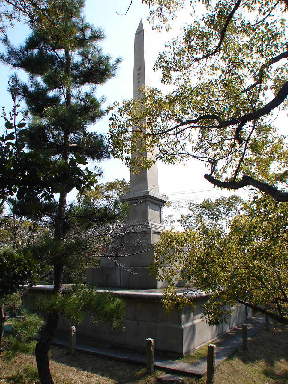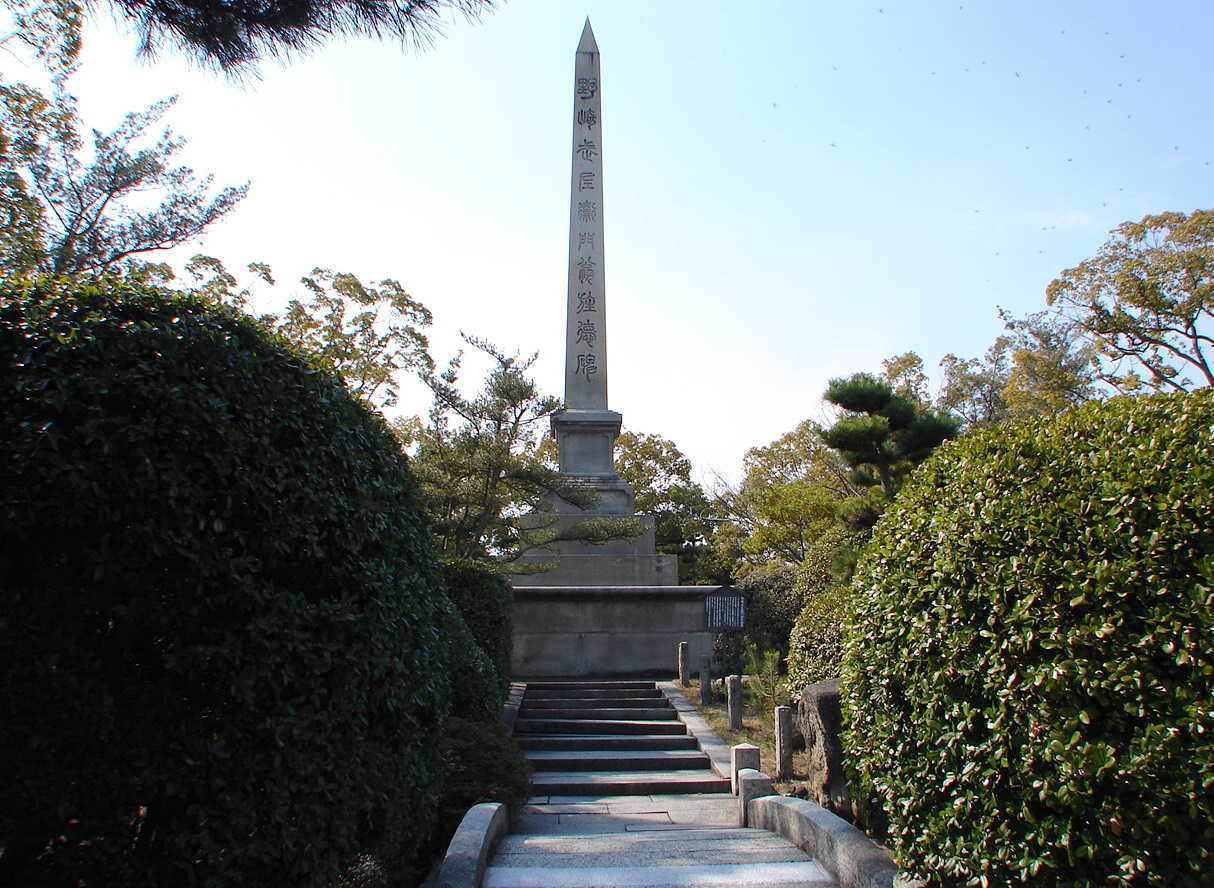 ![]() 野崎武左衛門翁旌徳碑 旧野崎家住宅から南西約400mの地にある、緑に囲まれた約1000坪の庭園は、野崎武左衛門の功徳を偲ぶ多くの人びとにより造られたもので、その中央に見事な石造大尖塔(旌徳碑)が1基と、青空に向かってそびえる1本のビロー樹があり、地域の人びとから「野崎の記念碑」とよばれています。碑の前には心字池を築き、大小の奇岩を配し、背後に築山を設けた池泉回遊式の庭園です。 |