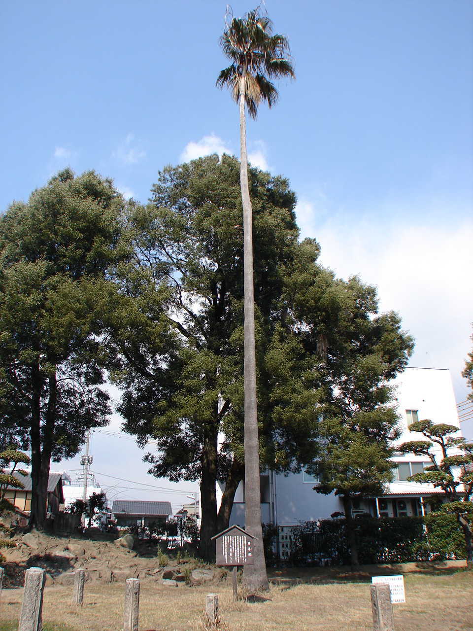 ![]() 蒲葵樹(びろうじゅ) ビロウ樹はヤシ科の常緑高木で、広くアジア亜熱帯地域に生息しています。この樹は大正10年(1921年)、野崎武吉郎(武左衛門の孫)が知人よりハワイ島土産として贈られたものを、ここに植えたものです。樹高約15m、根回りは約1.9mあります。当地は露地に植えたビロウ樹の育ちうる日本での北限と思われます。 |